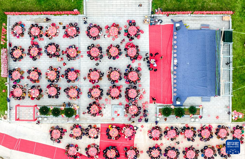 10月29日重陽節(jié),老人們?cè)诤笔★鰵w縣兩河口鎮(zhèn)太坪村參加長壽宴(無人機(jī)照片)。(新華社發(fā) 王罡 攝)