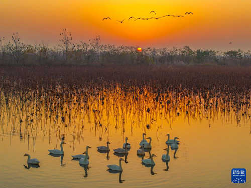 11月30日,群鳥(niǎo)在江蘇興化里下河國(guó)家濕地公園內(nèi)棲息、覓食(無(wú)人機(jī)照片)。(新華社發(fā) 周社根 攝)