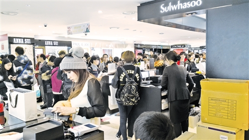 “雪花秀”品牌作為愛(ài)茉莉太平洋旗下的高檔化妝品品牌在中國(guó)游客中頗具人氣。圖為樂(lè)天免稅店首爾小公洞店“雪花秀”專柜,等待購(gòu)物的顧客排起了20米長(zhǎng)隊(duì),其中絕大多數(shù)都是中國(guó)游客。本報(bào)駐首爾記者 楊 明攝