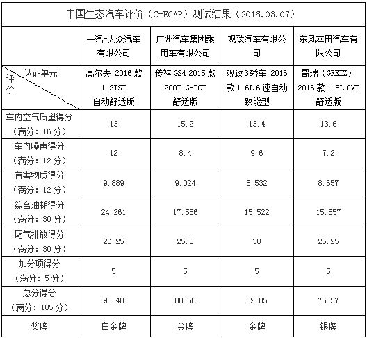 人民網(wǎng)天津3月9日電(鄂智超)日前,中國生態(tài)汽車評價(C-ECAP)新一批測試結(jié)果公布。本次共公布了四款車型,分別為一汽-大眾高爾夫 2016款 1.2TSI自動舒適版(90.40分)、廣汽傳祺GS4 2015款 200T G-DCT舒適版(80.68分)、觀致3轎車 2016款1.6L 6速自動致能型(82.05分)、東風(fēng)本田哥瑞 2016款1.5L CVT舒適版(76.57分)。其中一汽-大眾高爾夫車型獲得白金牌,廣汽傳祺GS4與觀致3轎車獲得金牌,東風(fēng)本田哥瑞獲銀牌。