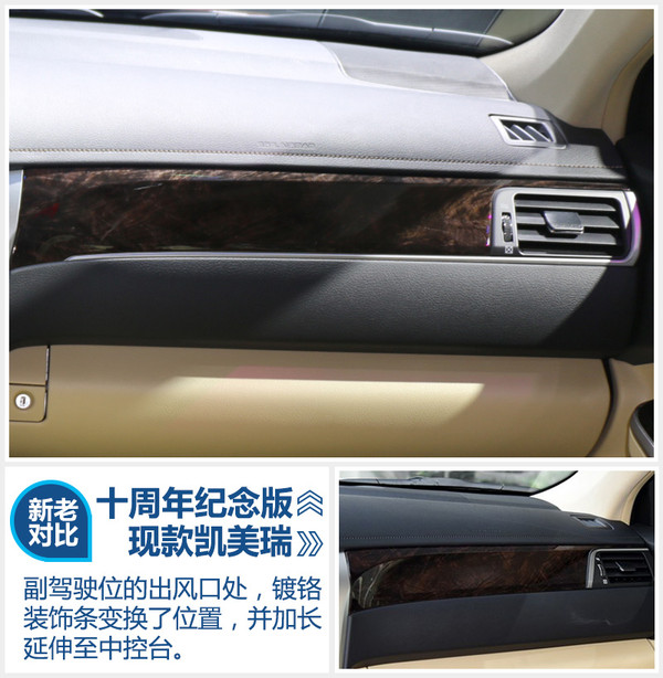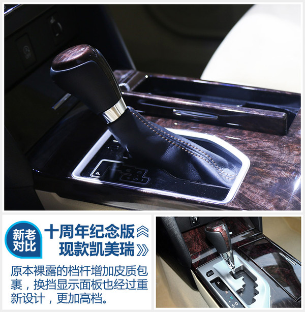 凱美瑞的“蛇形”換擋機(jī)制一直是筆者非常喜歡的設(shè)計(jì),最起碼在開車的時(shí)候不會因?yàn)閾Q錯(cuò)擋而發(fā)生意外碰撞。但是說實(shí)話,裸露的檔桿總覺得缺了點(diǎn)什么。十周年紀(jì)念版將檔桿周圍加上了皮質(zhì)包裹,立馬將中控臺的“氣質(zhì)”提升了一個(gè)檔次,筆者本人是非常喜歡的。另外,副駕駛面前的木紋面板也增加了一條鍍鉻裝飾。