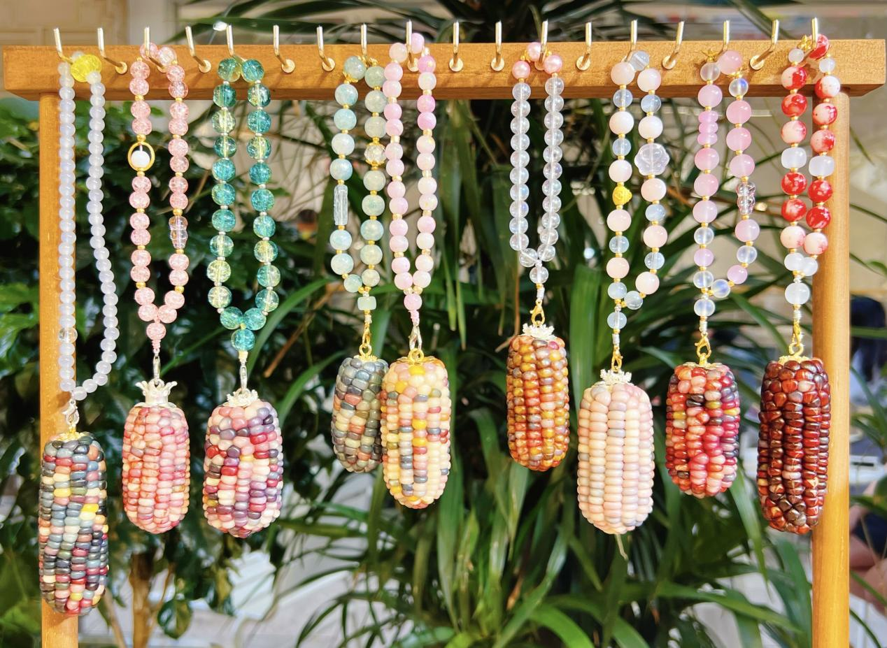 經自然晾曬、人工精選、手工創(chuàng)意后,高顏值的玉米迎來了“七十二變”:配上木質底座成為文玩擺件,單粒打孔輔以云南銀飾變成手鏈、鑰匙扣,掛飾、裝飾畫等。