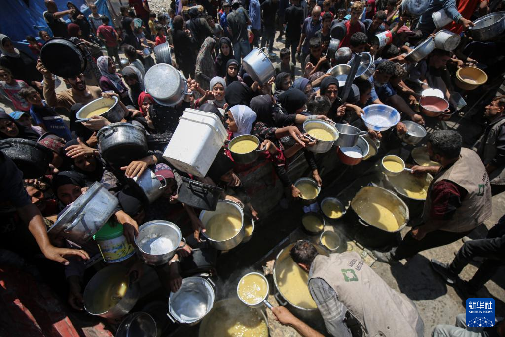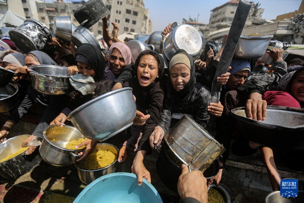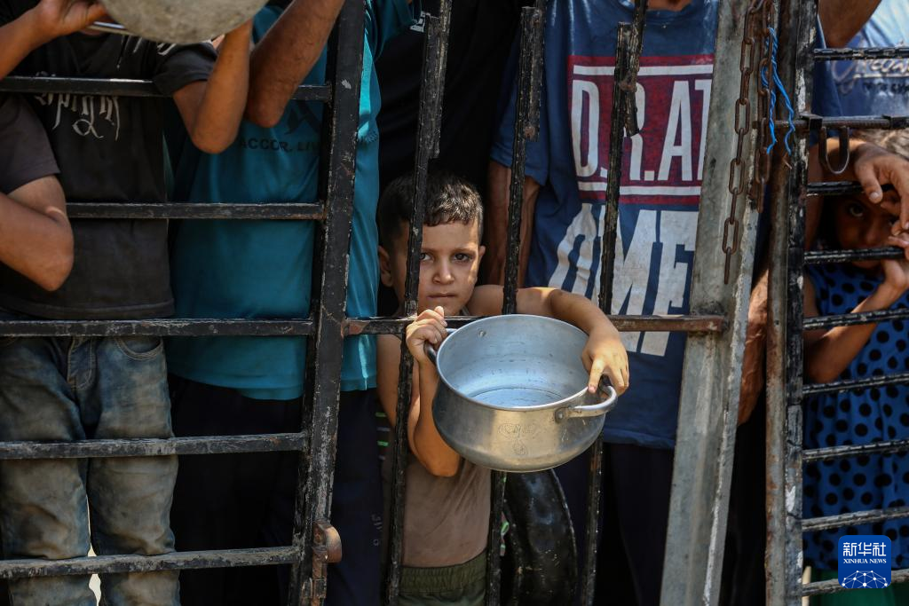 8月2日,流離失所的巴勒斯坦人在加沙城等待領(lǐng)取食物。新華社發(fā)(里澤克·阿卜杜勒賈瓦德攝)