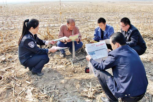為了將《中華人民共和國大氣污染防治法》和《五臺縣人民政府嚴防森林火災的通告》宣傳到戶、到人,五臺縣環(huán)保局組織工作人員,分組劃片深入到田間地頭,面對面讀報給農民聽,為農民解釋燒秸稈、燒荒等野外違規(guī)用火行為的危害。臺城鎮(zhèn)西關村66歲的農民張存在說:“你們這樣解釋,咱懂。我家4畝地的秸稈保證不燒一根?!眻D為五臺縣環(huán)保局工作人員在田間地頭宣傳環(huán)境保護相關知識。(金俊賢 辛宇 攝影報道)