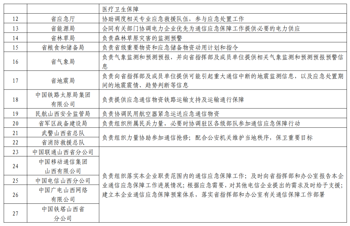 成員:省通信管理局、省委宣傳部、省委網(wǎng)信辦、省發(fā)展改革委、省公安廳、省財(cái)政廳、省自然資源廳、省交通廳、省水利廳、省衛(wèi)健委、省應(yīng)急廳、省能源局、省林草局、省糧食和儲(chǔ)備局、省氣象局、省地震局、中國(guó)鐵路太原局集團(tuán)有限公司、民航山西安全監(jiān)管局、省軍區(qū)戰(zhàn)備建設(shè)局、武警山西省總隊(duì)、省消防救援總隊(duì)以及省基礎(chǔ)電信企業(yè)等部門單位相關(guān)負(fù)責(zé)人。