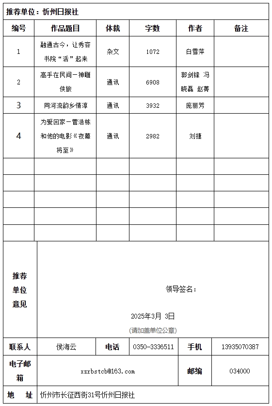 經(jīng)忻州日?qǐng)?bào)社編委會(huì)研究決定,以下作品擬推薦申評(píng)第34屆山西新聞獎(jiǎng),現(xiàn)予以公示。有反對(duì)意見(jiàn)者,請(qǐng)將反對(duì)意見(jiàn)書面報(bào)至統(tǒng)計(jì)考核部。