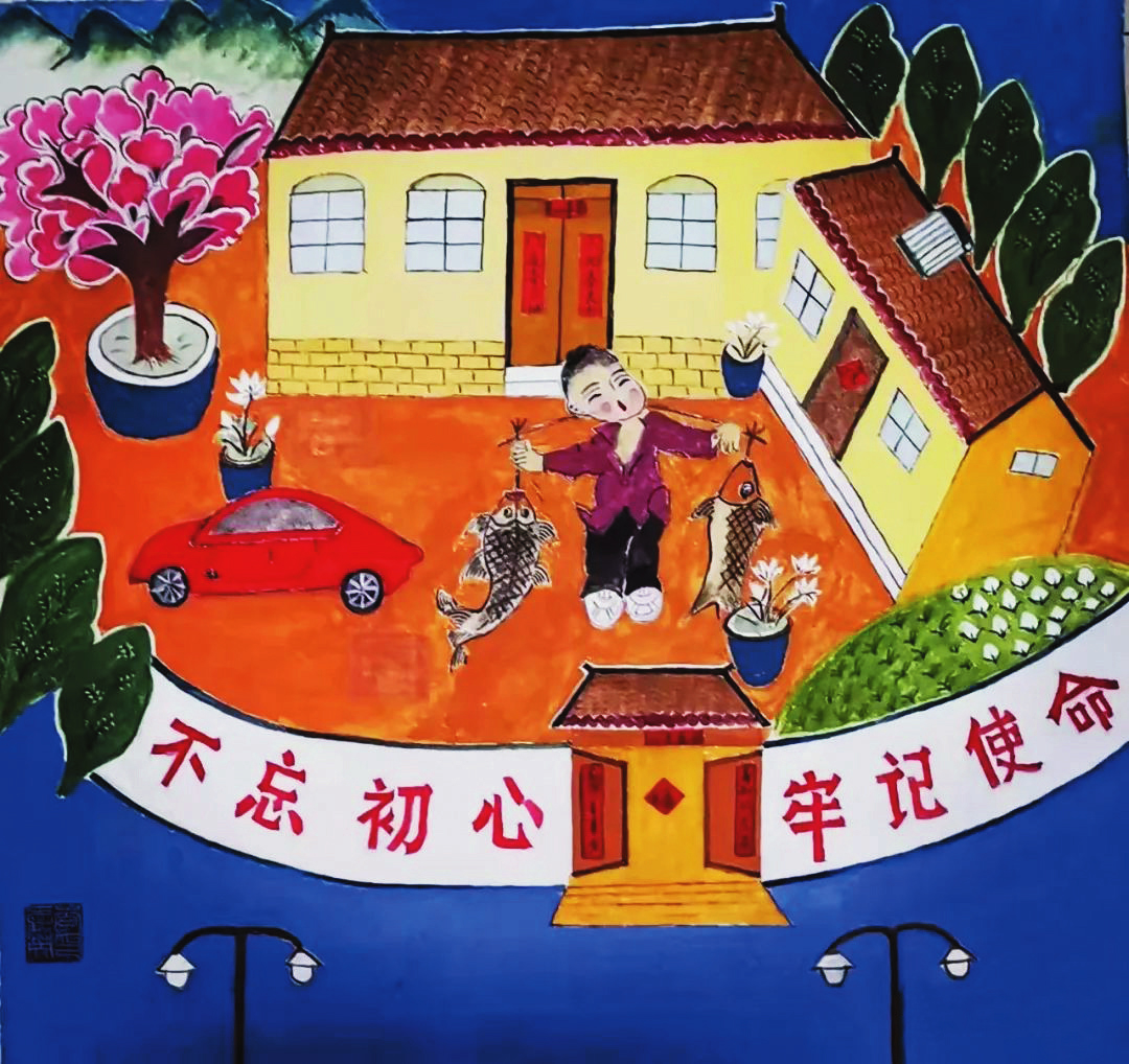 在代縣農(nóng)民畫促進(jìn)會黨支部和主席團的引領(lǐng)下,這些女畫家積極參與促進(jìn)會組織的各種交流和研討活動,不斷汲取藝術(shù)養(yǎng)分,深入探索研究農(nóng)民畫的創(chuàng)作技巧,使自己的繪畫技藝逐漸得到提升。她們特別注重借鑒代縣刺繡、面塑、剪紙等民間技藝的創(chuàng)作方法,從各種技藝當(dāng)中吸納有利于農(nóng)民畫創(chuàng)作的元素和營養(yǎng)。
