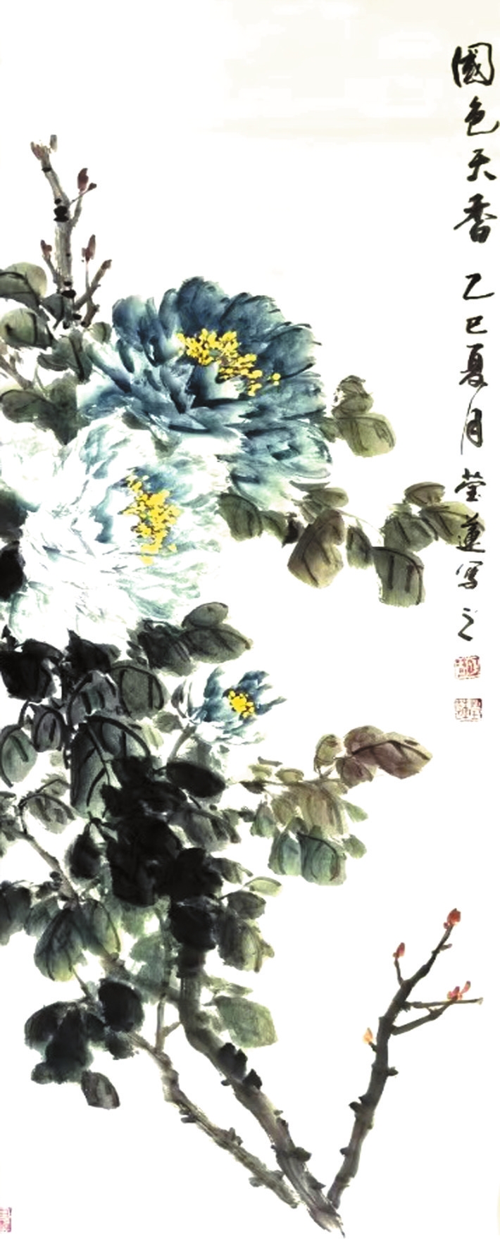 胡瑩蓮的筆墨并非刻意炫技,而是循著“應(yīng)物象形”之理自然生發(fā):牡丹花瓣以淡彩層層暈染,輔以墨線勾勒輪廓,既顯牡丹的華貴之姿,亦存筆墨的清勁骨力;紫藤枝條以側(cè)鋒揮掃而出,既有“折釵股”般的圓勁質(zhì)感,亦見藤蔓的靈動(dòng)意趣。恰如北宋畫家郭熙在《林泉高致》中所言的“筆補(bǔ)造化”,胡瑩蓮以筆墨為媒介,貫通物象的自然本真與人文意蘊(yùn)。