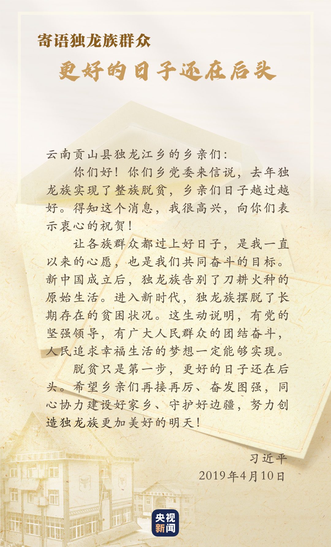 2018年,獨龍江鄉(xiāng)6個行政村整體脫貧,獨龍族實現(xiàn)整族脫貧,基礎(chǔ)設(shè)施、特色產(chǎn)業(yè)、社會事業(yè)等都發(fā)生了巨大變化。貢山縣干部群眾再次給習(xí)近平寫信匯報脫貧成績,習(xí)近平得知后非常高興,向他們表示“衷心的祝賀”,并勉勵鄉(xiāng)親們?yōu)檫^上更加幸福美好的生活繼續(xù)團(tuán)結(jié)奮斗。