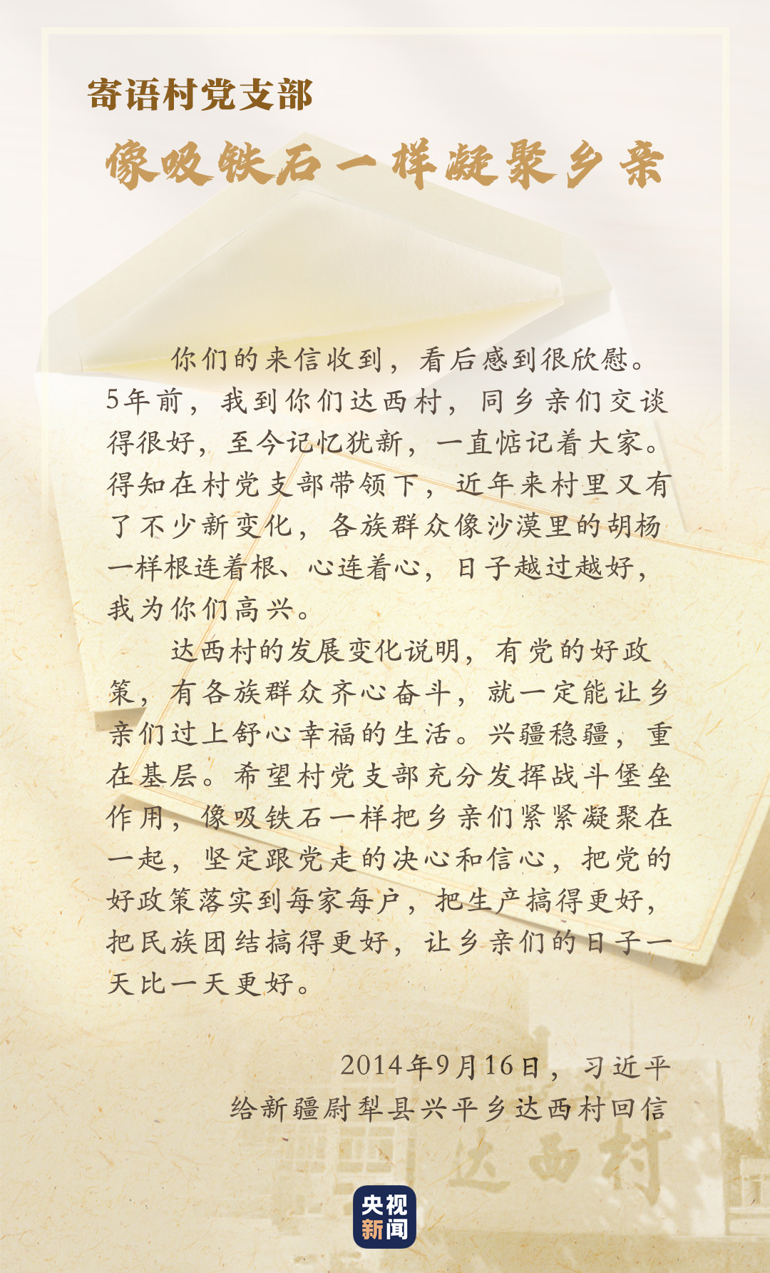 “口袋里要鼓囊囊,精神上要亮堂堂”。2014年4月,習(xí)近平在新疆考察時講到了達(dá)西村的村訓(xùn)。村民們懷著激動的心情給總書記寫信,匯報這些年村里的積極變化。當(dāng)年9月,習(xí)近平總書記給沙吾爾·芒力克和全體村民回信,強調(diào)興疆穩(wěn)疆,重在基層。