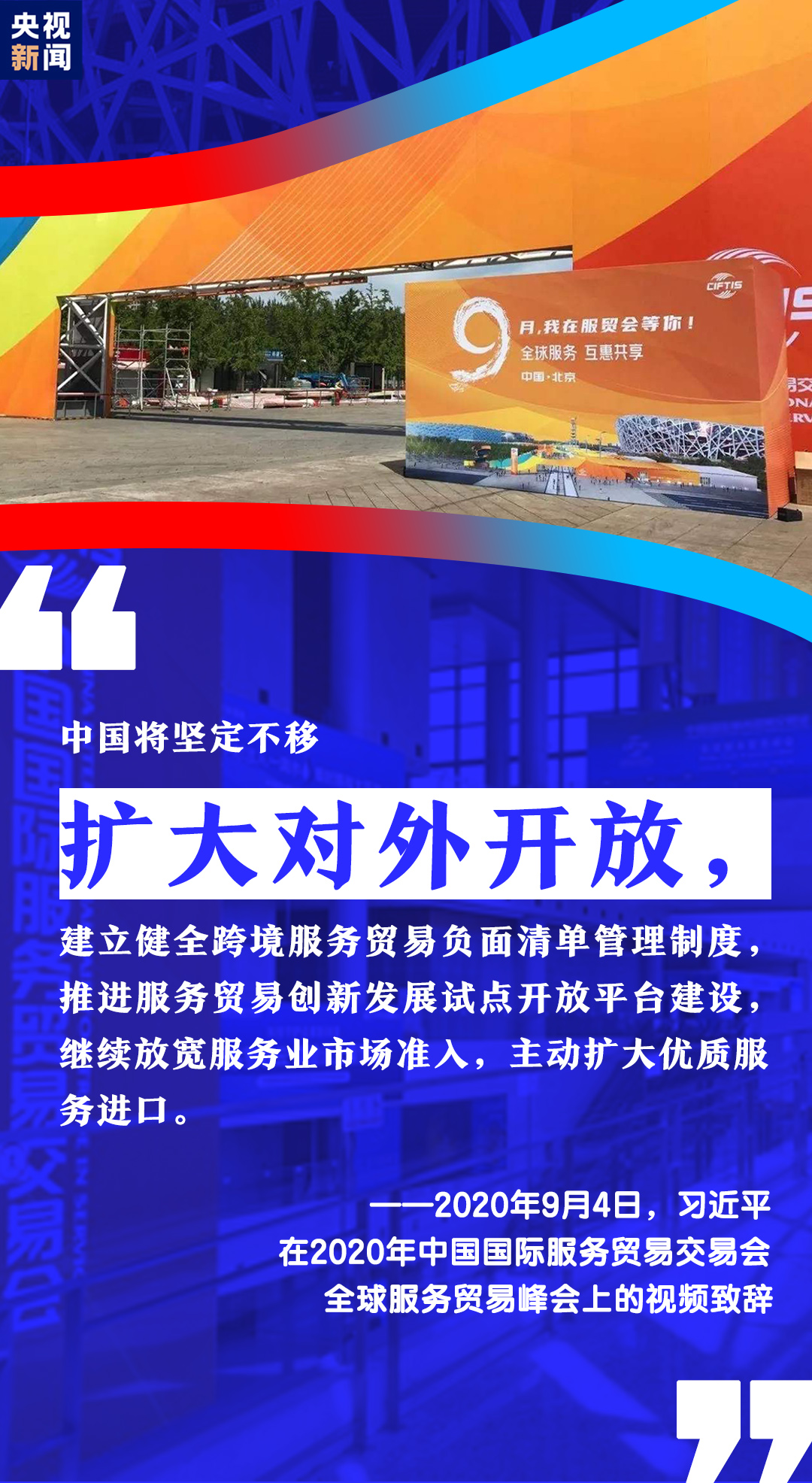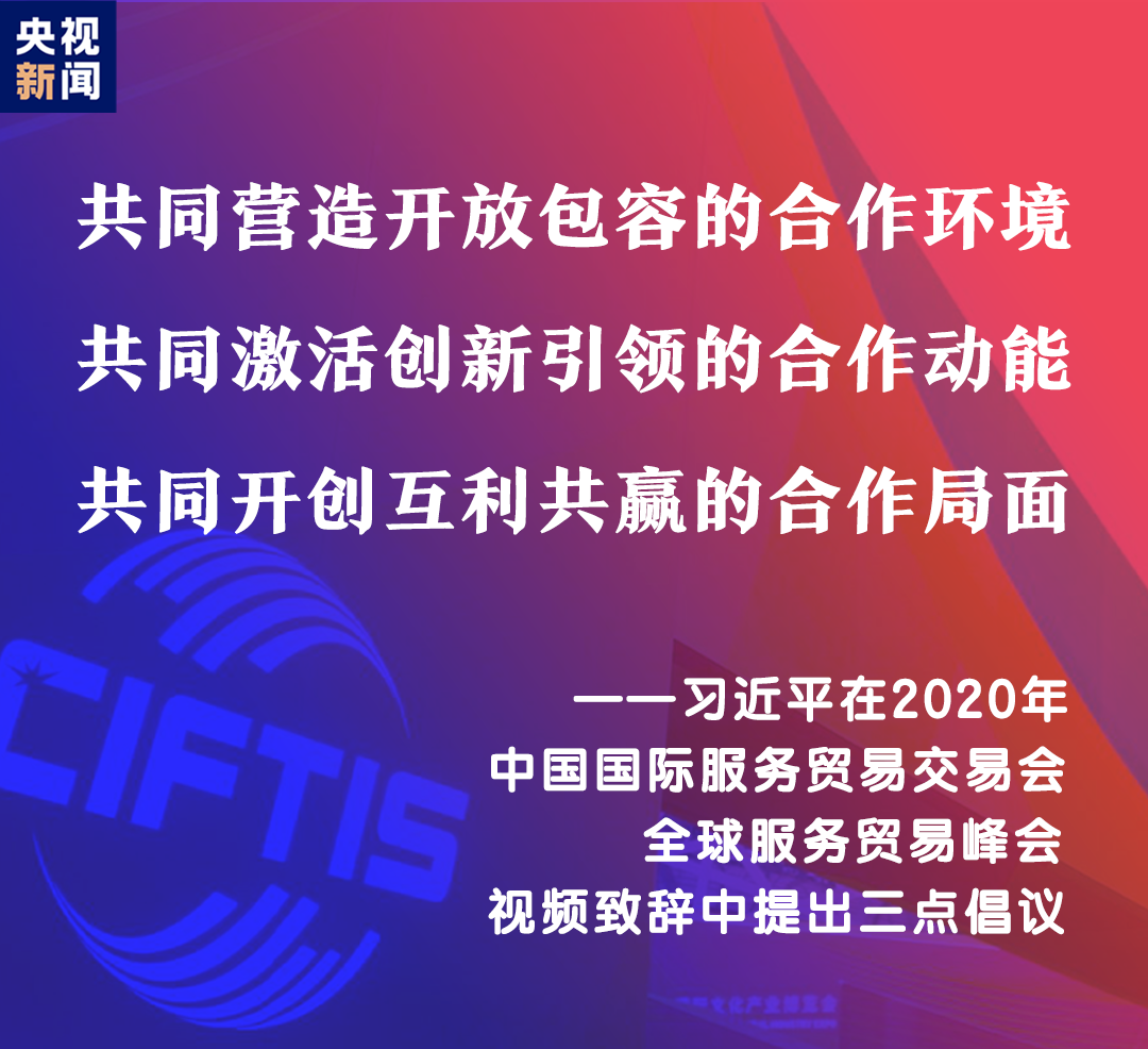 習(xí)近平表示,中國舉辦2020年中國國際服務(wù)貿(mào)易交易會(huì),就是搭建起平臺(tái)和橋梁,讓各國人民充分展示服務(wù)貿(mào)易領(lǐng)域新發(fā)展新突破,共同享受人類社會(huì)發(fā)展進(jìn)步新技術(shù)新成果。