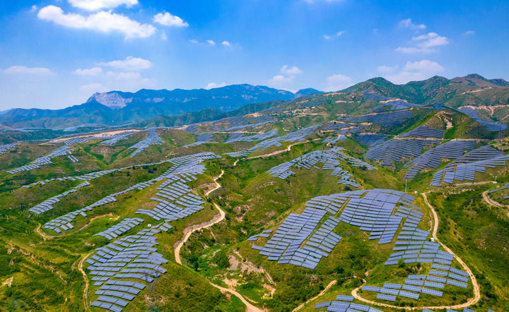 2023年7月18日,在山西省運城市稷山縣100MW光儲一體化項目基地,一排排整齊的光伏板與遠處的青山交相輝映。近年來,稷山縣因地制宜流轉荒山荒坡發(fā)展光伏產(chǎn)業(yè),增加農民收入,助力鄉(xiāng)村振興。(山西省委辦公廳 供圖)