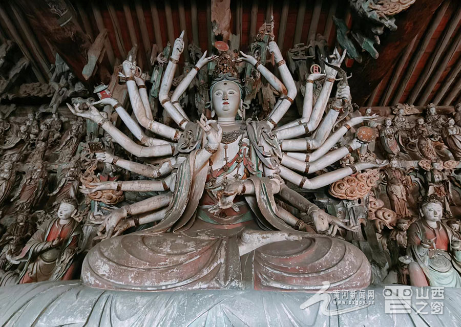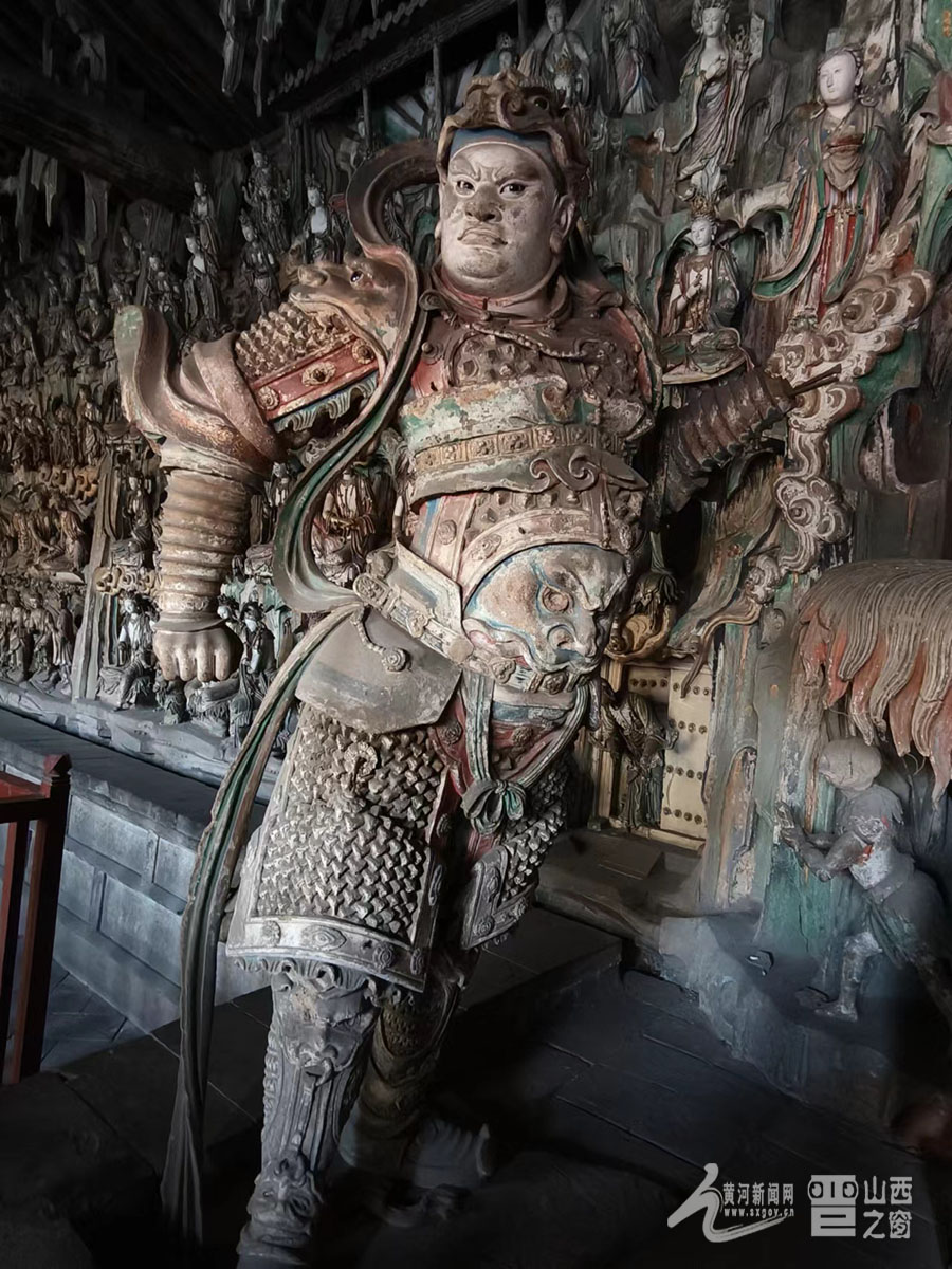 千手觀音像。牛牧瑤 攝 寺內(nèi)擁有總計2000多尊彩塑,大者丈余、小者尺許,每一壁龕為一獨立神話或佛教故事,人物造型生動,神態(tài)逼真,尤其以“千手觀音像”與“韋馱像”最為經(jīng)典。舞蹈《千手觀音》的靈感原型就是這尊千手觀音像。塑像高達(dá)數(shù)米,全身貼金,背后伸出上千只手臂,每只手掌上都有一只眼睛,錯落有致,整個造像氣勢恢宏,達(dá)到雕塑藝術(shù)中和諧、完美的境界。韋馱像巍然肅立,身披甲胄,神情凝重,整個身體呈現(xiàn)出一種微妙的動態(tài)平衡,是明代彩塑中少見的藝術(shù)杰作,被譽(yù)為“天下第一韋馱”“全國韋馱之冠”。景區(qū)講解員侯麗娟介紹:“這尊塑像的高明之處就在于匠師不落俗套,打破了一般程式的限制,賦予了韋馱一種時間的節(jié)奏性和動作的連續(xù)性,產(chǎn)生了雕塑作品的最高境界‘不動之動’?!?/p>