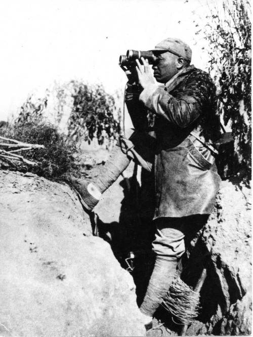 “誰敢橫刀立馬,唯我彭大將軍?!闭掌?,彭德懷大半個(gè)身體露在戰(zhàn)壕外,左腳踏在戰(zhàn)壕底,右腳蹬著戰(zhàn)壕前沿,坐靠在戰(zhàn)壕后沿上,手持望遠(yuǎn)鏡,神情專注地觀察戰(zhàn)況。